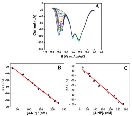 (A) DPV response of simultaneous sensing of 3-NP and 4-NP in various concentrations at 0.1 M PBS and (B,C) 3-NP and 4-NP concentration and corresponding cathodic current response calibration plot.