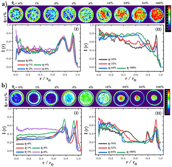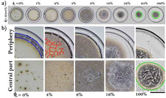 - Gorr, H.M.; Zueger, J.M.; Barnard, J.A. Characteristic size for onset of coffee-ring effect in evaporating lysozyme-water solution droplets. J. Phys. Chem. B 2012, 116, 12213–12220. [Google Scholar] [CrossRef]