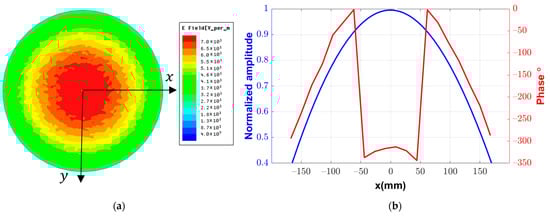 In order to obtain the required beam pattern of the reflectarray, the amplitudes and phase distribution on the plane of the reflectarray should be determined. In previous studies of reflectarray antennas, the field distribution is presented as a simple analytical approximation based on , where the value of is chosen to obtain the corresponding approximate radiation pattern of the feeding antenna. In addition, the phase distribution of the field on the aperture of the reflectarray is calculated in terms of the distance from the center of the feeding point to each point on the aperture of the reflectarray. In this paper, this approximation is replaced by directly calculating this field distribution numerically using the commercially EM simulation software HFSS. The advantage of this method is that it does not require any assumptions. Figure 3a shows the 2D distribution of the magnitude of the complex total field on an aperture located at a distance from the center of the fed element of the Yagi–Uda antenna. It should be noted that this is only a calculation plane and it does not represent any additional boundary to the simulation problem. This plane and the feeding antenna are included inside a common radiation boundary in the simulation process. This distribution can be presented as a radial function of the magnitude around the -axis. Figure 3b shows the 1D distribution of the normalized amplitudes along the -axis at the plane of the reflectarray. In addition, one can also obtain the corresponding phase distribution using the argument for this complex field, as shown in Figure 3b. These amplitude and phase distributions are discretized along the proposed grid of the reflectarray to obtain the amplitude and phase of the incident field on each element of the reflectarray.