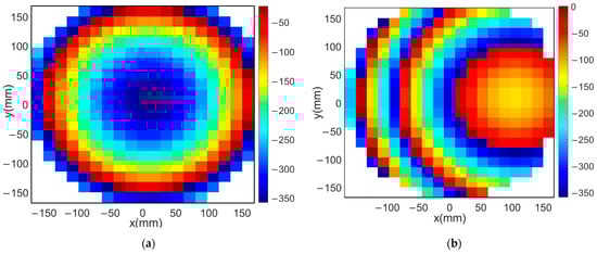 For the case of a pencil beam radiation pattern, the required total phase distribution on the aperture of the reflectarray antenna can be obtained analytically, as shown in Equation (4). Thus, the reflection phase of each reflecting element can be obtained by subtracting the phase of the feeding element from the required phase distribution of the aperture of the reflectarray. For the present reflectarray structure mentioned in Section 2 and the proposed Yagi–Uda feeding element, the required reflection phases on the aperture of the reflectarray for both broadside and tilted pencil beams with a tilting angle are shown in Figure 4a,b, respectively. It should be noted that the total number of reflecting elements is equal to unit cells, arranged uniformly in a planar grid with elements.