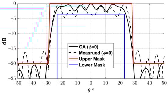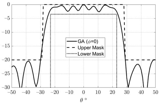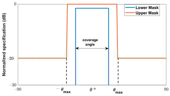 The constraints on the required radiation patterns are considered by using appropriate masks. The requirement of the flat-top normalized pattern is given by means of two mask templates, as shown in Figure 6, which impose the minimum and maximum values that the far field must achieve. Thus, if is the normalized array factor of the flat-top beam in , it should fulfil the following: