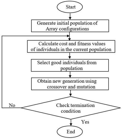 After determining the required radiation pattern for the proposed MEO satellite communication system and the amplitude distribution of the fields due to the feeding element, the corresponding phase distribution on the aperture of the reflectarray must be determined. This phase distribution is obtained using GA. In GA, the optimization starts with an initial population comprising a number of candidate solutions (designated as chromosomes). These parents are controlled using different factors (combination, crossover, or mutation) to make a new set of chromosomes for the next generation. During the advancement of the arrangement, chromosomes are reviewed with respect to the enhancement of the fitness between the obtained radiation pattern and the required mask. The higher-positioned chromosomes are chosen to proceed to the next generation. Once the new generation is formed, the fitness of its chromosomes is estimated and the process continues until the convergence condition is satisfied. The algorithm stops when the value of the fitness function for the best point in the current population is less than or equal to the fitness limit. The important basic genetic algorithm steps are presented in Figure 7.