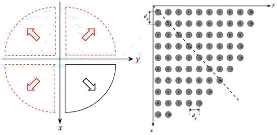 The main problem when applying GA is the large number of optimization variables, which correspond to all reflecting elements on the reflectarray. This large number of variables requires a large computational time, which affects the overall convergence of the optimization process. However, because the proposed flat-top radiation pattern and amplitude distribution of the fields due to the feeding element are radially symmetric around the -axis, as shown in Figure 3, the required phase distribution should be also be radially symmetric around the -axis. Thus, the number of the unknown variables can be reduced by taking into consideration this symmetry. For the case of a circular reflectarray as shown in Figure 1, the reflecting elements can be arranged into four image-symmetric quarters. Each quarter can also be divided into two symmetric halves, such that each column in the quarter would be the same as the corresponding perpendicular raw in the same quarter as shown in Figure 8.