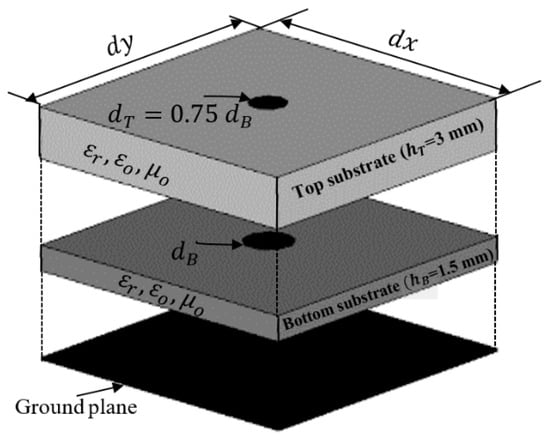 The previous section showed how to obtain the required phase distribution of the reflected fields along the surface of the reflectarray to obtain the required radiation patterns. The following step is to design this reflecting element and to show how it can be controlled to obtain the required phases. The proposed unit cell is composed of two conducting elements of circular shape stacked in two layers of FR4 dielectric slabs with a dielectric constant , as shown in Figure 11. The top substrate has a height and the bottom has a height . The stacked patches are backed with a ground plane. The bottom circular patch has a diameter , whereas the top patch diameter . The unit cell has dimensions .