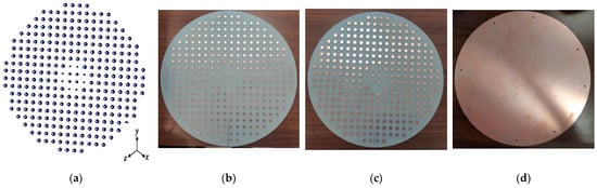 In this section, the above analyses for the required phase distributions and the reflecting element are combined to introduce the complete design of the proposed reflectarray antennas. Three designs are presented. The first has a pencil beam with a broadside radiation based on the phase distribution in Figure 4a; the simulation layout of the reflecting elements in this case is shown in Figure 13. It should be noted that directly allocating the dimensions for all these elements in this configuration on a simulation tool such as HFSS is complicated. However, this problem is simplified by generating a lookup table to convert the phase at each point on the reflectarray plane to the corresponding radii for the upper and lower circular patches of the corresponding element. Then, these radii with the corresponding centers are formatted as a Visual Basic Script (VBS), which is loaded directly by HFSS to draw the reflecting elements. This procedure introduces a significant improvement in developing the simulations. Figure 14 shows the simulated 3D radiation pattern of a broadside pencil beam with peak gain around . In Figure 15, the simulation layout of the reflecting elements for the tilted beam radiation pattern based on the phase distribution in Figure 4b is shown. The simulated 3D radiation pattern in this case is presented in Figure 16 and the peak gain is found to be nearly . Figure 17a shows the simulated layout of the reflecting elements for the flat-top pattern. This configuration was fabricated and measured to validate the flat-top pattern obtained by GA and that obtained by numerical calculation. Figure 17b–d shows the fabricated layers of the flat-top reflectarray antenna.
