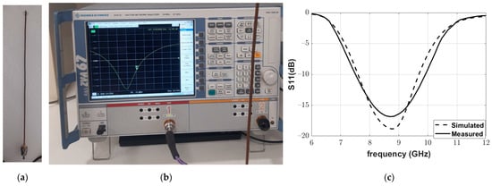 Measurement of the reflection coefficient of the fabricated Yagi–Uda antenna: (a) the fabricated Yagi–Uda antenna, (b) Yagi–Uda antenna connected to the Rhode and Schwartz model ZVA67 VNA, and (c) simulated and measured magnitude of the reflection coefficient.