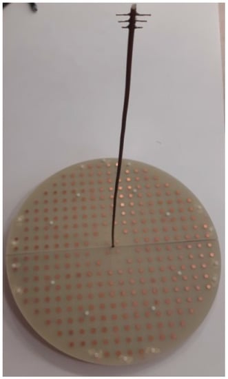 Moreover, a Yagi–Uda antenna was fabricated, as shown in Figure 18a, to complete the structure of the reflectarray. The frequency response of the reflection coefficient magnitude of the fabricated Yagi–Uda antenna was measured using a vector network analyzer (VNA; Rhode and Schwartz model ZVA67), as shown in Figure 18b. The excellent matching of the fabricated antenna at the operating frequency of can be noted in Figure 18c.
