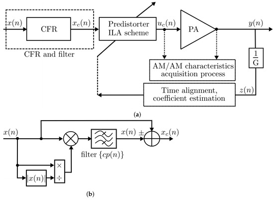 The CFR model identification algorithm is examined to establish a PAPR reduction for LTE 5-MHz and LTE 10-MHz bandwidth applications, and it is summarized in this section. The development of a platform for LTE applications based on a combination of linearization with CFR from estimation of instantaneous PAPR is able to estimate the maximum power of a sample in an OFDM transmitter symbol divided by the average OFDM power. This condition considerably improves the phase shifts that may exist between subcarriers of a transceiver system. In Figure 2a, it is shown a generalized structure cascade connected using a conventional computation of CFR and the PD model extraction. For this system, the transceiver signal is closed-loop feedback with being the PA output, as input signal in addition to the CFR stage known in clipping stages that together with the indirect learning approach (ILA) scheme generates a new to characterize the amplitude to amplitude (AM–AM) conversion curve of the DUT. Thus, the final signal can be generated from the inverse gain estimate, and correction for this process is crucial for the as shown in Figure 2b.