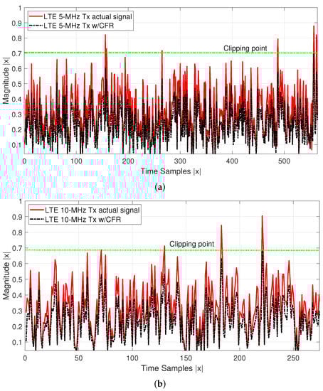 Table 1 shows the relationship obtained with each CFR test performed. It can be seen that the EVM obtained based on the clipping process varies in each stage, given the deterioration of the vector to be analyzed. The variation due to the improvement of the EVM can be related to corrections of the I/Q umbalance, phase gain, DC offset, among others. Figure 3 shows the actual LTE 10-MHz signal when comparing it with the resulted clipping signal both estimated using a frame with 76,800 complex-valued data samples while peak integrity is guaranteed. In Figure 4, the PAPR achieved in the transmitter Tx due to the clipping and filtering stages is shown on the x-axis. An example of an algorithm with lower computational complexity analysis related to CFR and DPD modeling with spline-interpolation coefficients LUT, which aims to preserve a learning rule based on parameters is reported in [24]. Equation (6) shows the represents the peak measured at the fundamental for the LTE implementations in this case of dBm for LTE 5-MHz and dBm for LTE 10-MHz, in addition to the values , for each transmitted symbol of 64–QAM digital modulation under OFDM multiplexing.