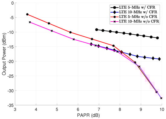 LTE 5–MHZ and 10-MHz signal PAPR vs. output power level with and without CFR applied.