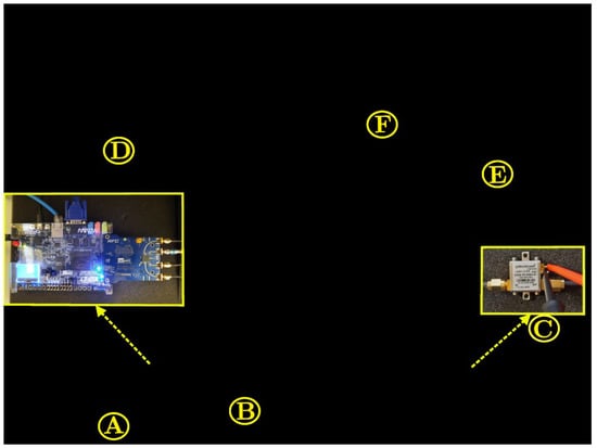 Experimental testbed photograph. Relevant instruments depicted as follows. (A): Altera Cyclone V FPGA SoC-Kit. (B): AD9361 RF Agile Transceiver working at GHz center frequency. (C): High isolation amplifier Mini-Circuits ZX60-5916MA+. (D): Power Supply GW INSTEK GPS-3303. (E): Display HOST PC-MATLAB. (F): Spectrum Analyzer SIGLENT SSA3032X.