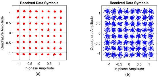 Constellations diagram for the actual transmitter LTE 10-MHz 64–QAM signal and CFR scale factor, (a) actual 64–QAM 10-MHz signal, and (b) receiver signal.