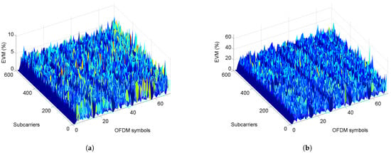 To perform the test and evaluation of the proposed methods, separate experiments are carried out. The first measurement tests are conducted with the identification of CFR, ACPR, and PAPR, to estimate the values in a feedback iterative procedure. The measurement system includes the FPGA, RF transceiver dual-channel sub-6 GHz, wideband amplifier ZX60-5916MA-S+ that feature a typical gain ≈ dB biasing with 5 V. At the feedback path, a receiver is used to digitize the down-converted signal using an I/Q demodulator operated at a sampling rate of MHz, while an interpolation filter is applied as data rate is set for a given bandwidth. Here OFDM symbols and subcarrier EVM (%) against subcarriers in the frequency domain and symbols in the time domain are described. In this case, the EVMs are calculated for each carrier within a frame and the peak values are displayed in the 3D graphic, the EVMs for each carrier are shown for 64–QAM using frequency division duplex (FDD). In this implementation, the EVM performance is evaluated based on a reference measurement channel (RMC) for a downlink test. The digitally modeled signal to measure the peak and root mean square (RMS) EVM average of the input signal frames.
