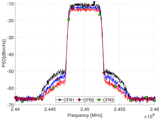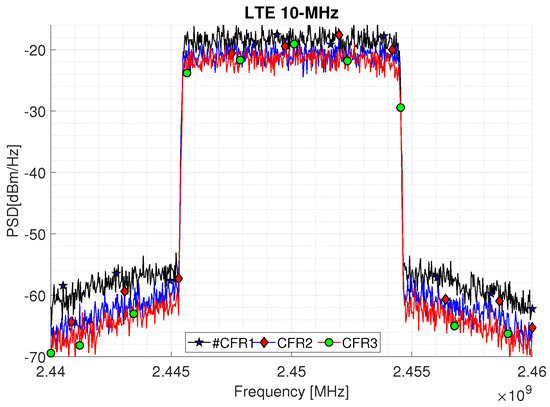 Comparing Table 2, it can be seen that CFR reduce the PAPR of the developed system. The PA measurements as DUT include the analysis of the PAPR and ACPR based on a variation of the clipping in the CFR stage. Figure 8 and Figure 9 depict the power spectral density (PSD) performance for the CFR factors as summarized in Table 2 for the 5 and 10-MHz bandwidth signals, respectively. Figure 8 shows the ACPR for three CFR factors, where a PAPR at the Tx shows an improvement of dB for a LTE 5-MHz. While an improvement of dB is obtained for the LTE 10-MHz as shown in Figure 9, which represents a trade-off between the PAPR and ACPR controlled by the CFR threshold and n clip factor; this is represented by Equations (1)–(9). The actual signal exhibits a PAPR of around dB with an output power dBm for an LTE 5-MHz. In this sense, it is considered that the CFR can be targeted from PAPR level outputs from to for a LTE 5-MHz and from to for a LTE 10-MHz. This conditions represents a variation that derives directly from the clipping threshold defined by Equation (9), where L is the desired level of clipping, additionally a CFR of Algorithm 1 is shown with a PAPR target established as a means of optimizing the process.