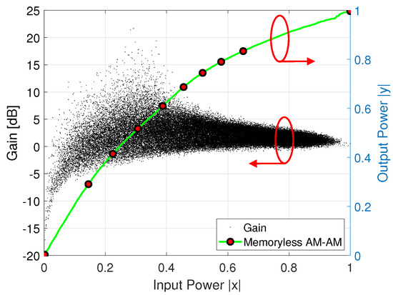Gain for the normalized input and output signal vs. memoryless AM–AM characteristic.