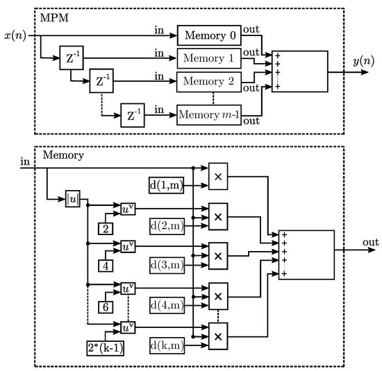 As mentioned before in a first approach the CFR uses the baseband LTE signal to reduce the clipping in the signal, thus improving the PAPR. However, the residual spectral regrowth can be also mitigated by applying DPD. The Volterra series variation provides an approximation on nonlinear effects of the short-term memory effects of a DUT under test and the linear time-invariant (LTI) stage. In this sense, a structure derived from the Volterra Series is chosen as the memory polynomial model (MPM) to introduce in a single-stage the static and non-linear functions to represent the AM–AM recorder [26,27]. In this case, by taking into account only the diagonal kernels, the MPM makes an adequate approximation of the model. The structure used by the MPM is representative of the Equation (17):