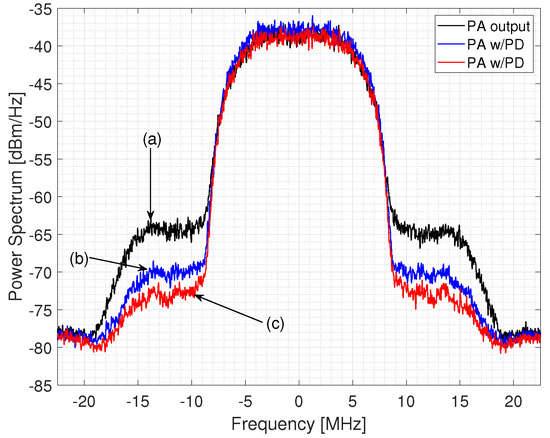 where u is the magnitude of the input signal. Note that the AM–AM and amplitude to phase conversion (AM–PM) parameters, although similarly named alpha and beta, are distinct. For the linearization of the MATLAB virtual amplifier (Saleh model), ILA is used in Figure 13; the spectral growth of the received signal is observed as a result of the use of the amplifier where DPD is not used as before the PA, while in Figure 13 we observe the spectrum of the received signal where its power values decrease in the bands thanks to using the DPD with ILA with and , that is, three memory stages with a depth of 6, that is, with 18 coefficients the polynomial model. The behavior modeling for derive the predistorter stage is carried out starting from the device characteristics, measurement, and modeling of an RF PA, which considers memory effects and nonlinearity; where the function of the input and the output are interchanged as shown in Equation (14), to model the nonlinear function of the linearization as is represented in Equation (15). For the modeling design, the sweep of the input tone is taken into account, the measurements of the modeling of the AM–AM conversion curve is the basis for the calculation of the coefficients , which generates a new input based on the DUT peak gain is represented by the Equation (14) where the even and odd coefficients based on the LSE method are taken into account. The predistorter effectiveness for two configurations of parameters k and m are summarized in Table 3.