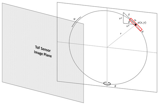 where α is a scaling factor for converting radial motion to the pixel domain, r is the radius of radial motion, and is the angular velocity of the object. In our experiments, the angular velocity of the object is constant and depends on the speed of the motor that is driving the radial motion. The relationship between the velocity, , of a pixel when the motion path of the pixel is not parallel with the image plane of the ToF sensor and the velocity, , of the pixel when the motion path of the pixel is parallel with the image plane of the ToF sensor is given as: