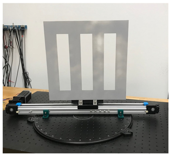 For the experiments with linear motion blur, we used a custom linear motion device. The linear motion device was also mounted onto the rotating optical breadboard to allow the linear motion device to be positioned at different rotation angles with respect to the image plane of the ToF sensor. The linear motion device includes a target with three vertical openings. The target was laser cut from 1/8” acrylic plexiglass. The dimensions of the target are 381 mm by 381 mm. The dimensions of each vertical opening are 76 mm by 254 mm. The target is mounted to a 500 mm belt drive linear guide rail and is moved along the linear guide rail using a 4.2 A Nema 23 stepper motor [51] that is controlled using a DM542T stepper motor driver [52] and an Arduino Uno [50]. We collected data moving the target at the maximum speed of our linear motion device which is 3.3647 m/s. Our linear motion device is shown in Figure 8.