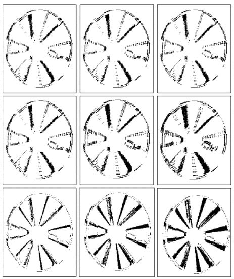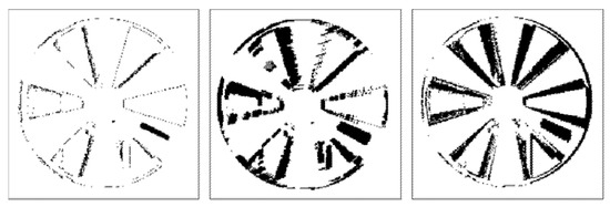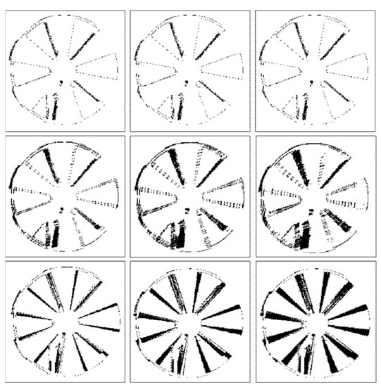 Figure 9 and Figure 10 illustrate binary depth maps from our radial motion experiments that show the locations of zero-value pixels (in black) and non-zero value pixels (in white). Figure 9 corresponds to the results when the Siemens Star is parallel to the image plane of the ToF sensor. Figure 10 corresponds to the results when the Siemens Star is at a 30° rotation from the image plane of the ToF sensor. In each figure, the first row shows depth maps of the Siemens Star in a static position without motion, the middle row shows depth maps with synthetic radial motion blur at different speeds, and the bottom row shows depth maps with real motion blur at different speeds.