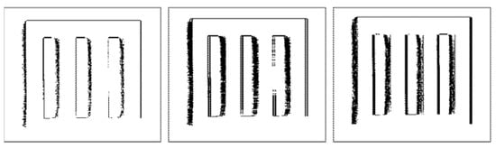 Figure 11 and Figure 12 illustrate binary depth maps from our linear motion experiments. Figure 11 corresponds to the results when the linear target is parallel to the image plane of the ToF sensor. Figure 12 corresponds to the results when the linear target is configured at a 30° rotation from the image plane of the ToF sensor.