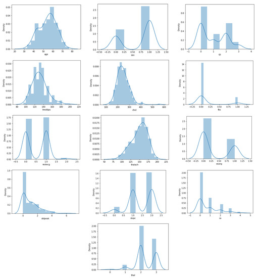 Figure 3 depicts the plotting of all of the features in the dataset (13 features). We can see that four attributes, namely age, trestbps, chol, and thalach, have a normal distribution. The most dominant value of gender is male, whereas in the CP attribute, the most frequent value is 0, and the lowest frequency is 3. Besides,