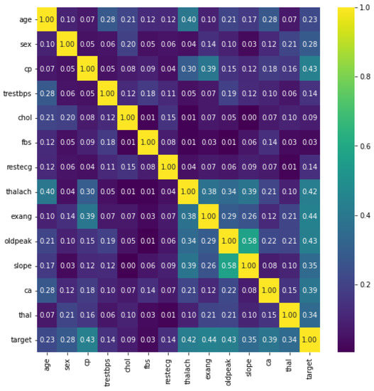 Figure 4. The figure gives us many facts. Firstly, the five features showing the most class–feature dependence are {exang, cp, ddpeak, thalach, and ca} with correlations of 0.44, 0.43, 0.43, 0.42, and 0.39, respectively. The second fact denotes the feature–feature correlation shown in slope–ddpeak, thalach–age, slope–thalach, exang–cp, and exang–thalach with correlations of 0.58, 0.40, 0.39, 0.39, and 0.38, respectively. On the other hand, fbs, chol, trestbps, and restecg have the lowest correlation with the target.