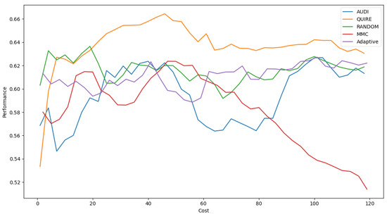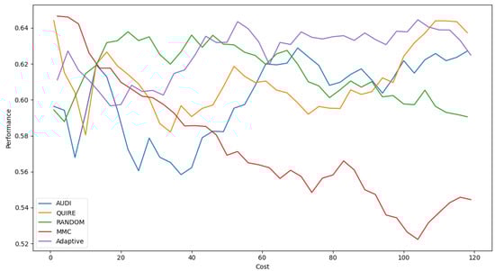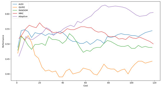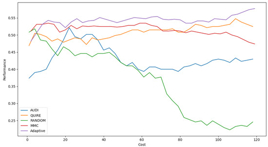 Figure 7 represents the complete profile of the Adaptive strategy method versus others in terms of F-score under the exact same cost(s). Unfortunately, the cost metric does not indicate a threshold of stability insight about the F-score of the Adaptive method. However, it performed better when the cost value was ≥ 60. During the cost increase, the approximated insight became stable and valid.