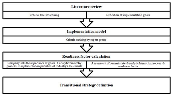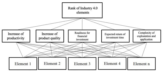 As shown in Figure 1, through literature review the criteria tree is structured and those are elements of Industry 4.0 most commonly mentioned, as well as the elements of ideal model of process planning using the Industry 4.0 concept []. Similarly, the goals for the Industry 4.0 implementation are defined, representing the target which the company expects to achieve with digitization. The criteria are assigned (Industry 4.0 elements) weights by an expert group from the field, consisting of 30 experts, 15 from academia, and 15 from the industry. They evaluate the priority and importance of its implementation according to each of the goals set. This is the implementation model which shows the ranks of importance of Industry 4.0 elements by priority of its implementation, specialized for process planning. The model is structured according to principles of analytic hierarchy process (AHP method) in which, in the first phase, Industry 4.0 elements are set as alternatives and goals as criteria. The data input in this phase are goal preferences of a single company and the output is the rank of the elements according to the need for optimal implementation. To calculate the readiness factor and generate optimal transitional strategy, the ranks of Industry 4.0 elements from the previous phase are modelled in the analytic hierarchy process as criteria with two possible alternatives—the current state and the ideal state of the company. Evaluation of these alternatives is set by results from the questionnaire filled in by company representatives in which each question is linked to each Industry 4.0 element. The results are normalised, and the readiness factor is calculated in comparison to the ideal state. The detailed mathematical procedure will be described in the following chapters.