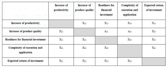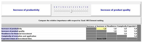 In Figure 2, the priority matrix of the company’s preferences is shown. It requires the input data provided by the company representative who evaluates the importance of each goal for the company’s future state. According to the AHP method, the importance is set in pairwise comparison on a scale from 1 to 9, where 1 is the lowest and 9 the highest importance, which can be illustrated with a priority matrix and later used for further steps of calculation.