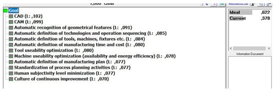 Felch et al. [], Gracel and Lebkowski [], and Antony et al. [] have recognized the difference in the implementation of Industry 4.0 elements in different manufacturing sectors. This is, once again, confirmed in this research in where the model for the readiness factor calculation is oriented to process planning and the priorities for implementation of Industry 4.0 elements are defined by certain goals company aims to achieve in the future, specially in this field.