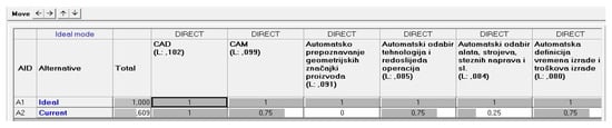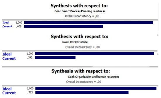 This means that the model for the readiness factor calculation by the AHP principles is structured so that the elements of Industry 4.0 with rank weights from the previous step are now the criteria with only two possible alternatives—the ideal state and the current state (Figure 4). This was provided by Expert Choice software and the normalized results from the questionnaire are filled in as weights of the alternatives directly. This is how human subjectivity is minimized and the criteria and alternative evaluation process quantified.