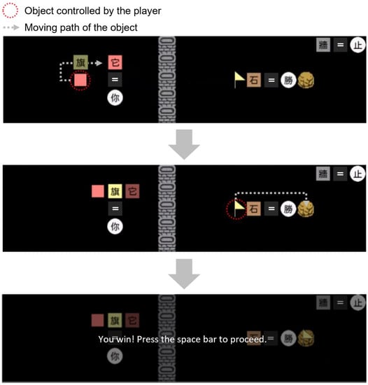Figure 2 illustrates a solution regarding the episode depicted in Figure 1. A player can first move the blank pink square along the route indicated by the dotted arrow to push the word tile 旗 (meaning “flag”) and change the equation made by the word tiles (the top panel in Figure 2). The new equation indicates that the player can now control the flag on the right side of the game field, and the player can further move the flag to touch the stone to win the game (the middle and bottom panels in Figure 2). All the operations are executed by using the arrow keys in the keyboard, and in some cases where the episode may reach a dead-end (e.g., no objects are connected with the descriptor 你), an additional z key that can restore the game to the status of previous steps is provided to the participants.