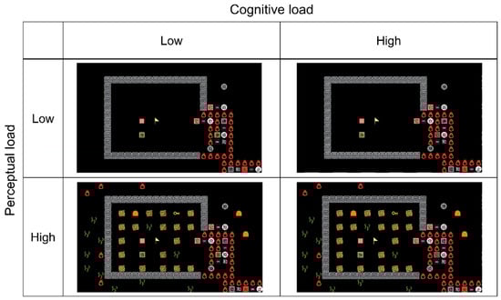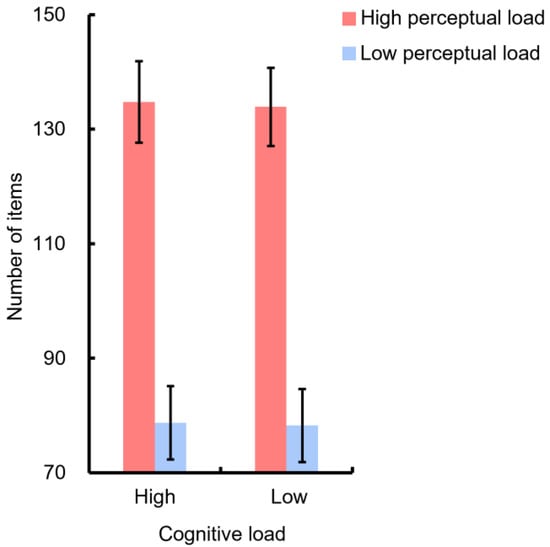 Figure 4 depicts the average number of items of the four mental workload conditions adopted in this study, which indicates a significantly higher number of items in the high perceptual load condition (F(1,7) = 52.06, p < 0.001). On the other hand, the cognitive load was manipulated by changing the position or the identity of the key elements without changing the number of items presented in the game field; thus, there was no statistical difference in the number of items between the high and low cognitive load conditions (F(1,7) = 3.54, p = 0.1).