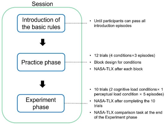 Figure 5 depicts the procedure of the sessions. Each session was divided into three parts. In the first part, participants were asked to complete 15 simple episodes, which introduced participants to the basic rules of the task. If participants failed to pass all the episodes in this part, the experimenter would pick up the episode in which the participants failed and re-introduce the rules indicated by the episode and the way to pass the episode. Then, participants were asked to conduct again the episodes that they had failed. The above procedure would repeat until participants could pass all 15 episodes ensuring that participants were familiar with the basic rules regarding the task. After the introduction phase, to be familiar with the task, participants were given four blocks of three episodes where each block corresponded to one of the mental workload conditions. After each block, participants were asked to complete the NASA-TLX. Finally, in the experiment phase, participants were asked to complete a block of 10 episodes after which the NASA-TLX was conducted again, followed by the comparison task of the NASA-TLX mentioned in Section 2.4. In the practice phase and the experiment phase, each episode had a five-minute time limit, and participants were asked to pass the episode using as few steps as possible. After the participants passed the episode or reached the time limit, the episode would be terminated and the participate moved forward to the next episode.
