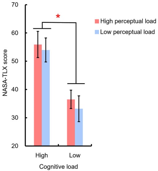 NASA-TLX scores differed in different mental workload conditions. Error bars indicate one standard error from the mean. * p < 0.05.
