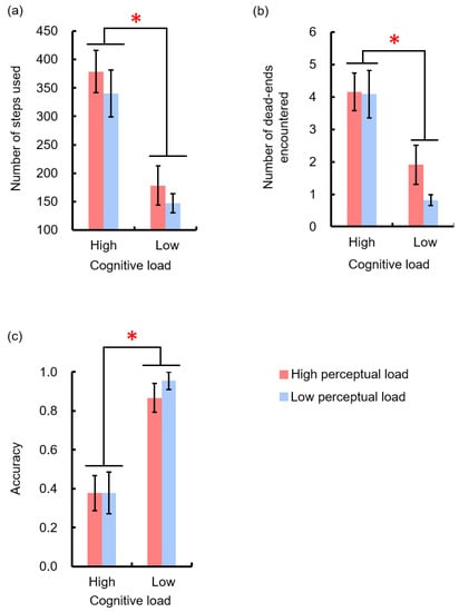 Behavior performance in episodes with the different mental workloads. When encountering episodes with a higher cognitive load, participants (a) needed more steps to pass the episode, (b) encountered a higher number of dead-ends, and (c) had a lower accuracy. Error bars refer to one standard error from the mean. * p < 0.05.
