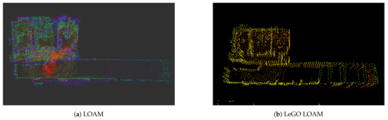 Figure 5 presents the resulting maps for LOAM and LeGO LOAM. We used the same dataset introduced in 2D SLAM [62], but in this case, the topic used was /velodyne_pointcloud. In the case of Figure 5a, this method adds all relevant points into the map. However, it can be seen that the map is partially less clear. Figure 5b shows clearer and more ordered map, thanks to the planar and edge detector module. For example, it is possible to distinguish better walls, floors, and roof, and the probability of obtaining a deformed map is lower than with the basic LOAM.