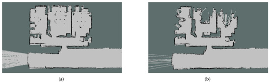 HectorSLAM is another approach for the fast online learning of occupancy grid maps, combining robust laser matching with a system based on inertial sensing [54]. This could be adapted to multiple challenging environments, for example, the authors tested their solution on unmanned ground vehicles in simple environments, as well as environments with complex structures, and it was also additionally tested on an unmanned surface vehicle in a river. This approach works with high-frequency sensors, so if it is used with a sensor whose sampling rate is low, some problems can arise, as shown in Figure 3c. This happens because the approach seeks to match the different samples one behind another, but if the time between samples is big and the robot moves or rotates too quickly, the algorithm cannot match the samples. This method is based on the optimization of beam endpoint alignment using the Gauss–Newton equation.