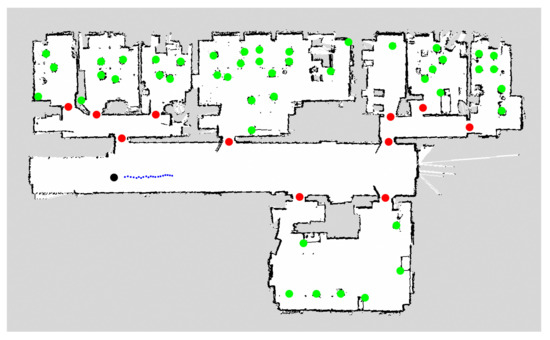 Semantic map obtained with a 3D LiDAR (Velodyne VLP-16) and the approach presented in [32]. Chairs are depicted in green, doors in red and people’s tracked paths in blue. The robot location is given by the black circle.