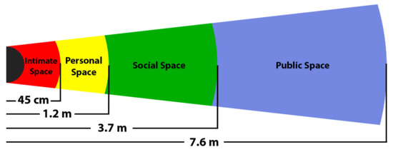 - Hall, E.T.; Birdwhistell, R.L.; Bock, B.; Bohannan, P.; Diebold, A.R., Jr.; Durbin, M.; Edmonson, M.S.; Fischer, J.; Hymes, D.; Kimball, S.T.; et al. Proxemics [and comments and replies]. Curr. Anthropol. 1968, 9, 83–108. [Google Scholar] [CrossRef]