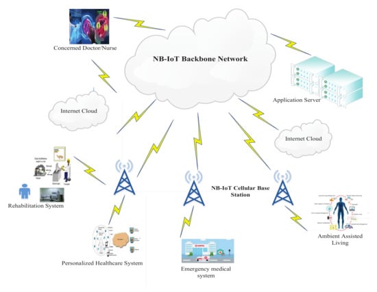 Healthcare is boosted as an application domain that appears to be very promising for enhancing service quality of the patients due to the Internet of Things (IoT), cloud computing, and Wireless Body Area Network (WBAN) technologies, as well as the interactions among those [2]. Some wireless technologies (e.g., ZigBee, Bluetooth, LoRa, Sigfox) are used in healthcare applications; however, some recent studies [3,4] have already revealed that the Narrow Band IoT (NB-IoT) is more suitable for healthcare applications in terms of licensing policy, long-range data transmission performance, energy-efficiency, etc., than other technologies. The fact that the NB-IoT is a Low Power Wide Area Network (LPWAN) technology facilitating a long-range and deep indoor coverage makes it perfect for a typical smart hospital context [5,6]. Furthermore, it offers seamless connectivity between patients and concerned medical personnel.