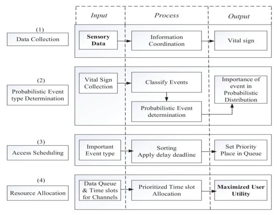 It is significant to ensure the data transmission of the healthcare system by making prioritization for various data from different sensors and to guarantee the diverse quality of services to those events [28]. In this paper, the prioritized scheduling of data packets generated from different UEs is inspired by the fact that different diagnostic reports are related to each other, and the importance of an event is determined by the degree of its relevance with one or more other parameters. Initially, the eNB allocates time slots to uplink users, assuming that they are producing data within the normal range. Once it receives data from different users, it examines and finds out the relationship among the events, including the selection of the priority of the concerned event.