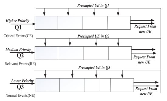 If any unscheduled higher priority events desire to join the eNB during the current transmission queue process, they must be handled by an eNB for effective scheduling and prioritized access. In this case, Figure 3 shows that the ready queue is divided into a multilevel queue approach, with the first queue having the highest priority and containing all critical events, the second queue having the next higher priority and representing all relative events, and the third queue having a lower priority and holding normal events.