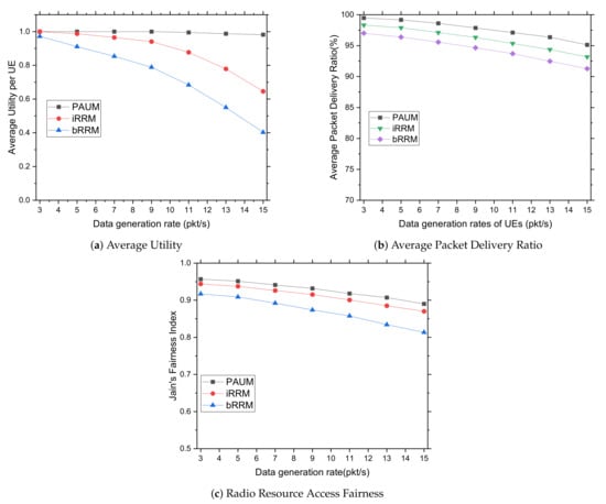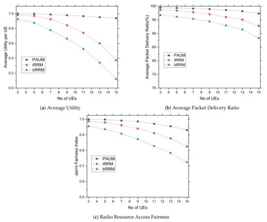 Finally, when compared to other systems, the proposed PAUM has the highest resource sharing fairness for changing numbers of UEs, as shown in Figure 5c. This is due to the network’s bandwidth being divided with suitable event urgency, using channelization on time by Equations (8) and (9). Due to a lack of priority and correct coordination with channelization and time slot with bandwidth, bRRM and iRRM do not adequately share resource allocation. The resources are equitably distributed across the UEs following their priorities, and the bandwidth is distributed in such a way that data transfer from the assigned node is reduced. As a result, PAUM achieved a higher fairness index over bRRM and iRRM.