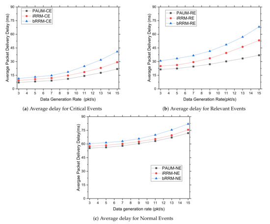 Such an excellent performance improvement is achieved due to the fact that, with the increasing data generation rates, the PAUM system efficiently categorizes different events and allocates radio resources in a prioritized manner and mitigating interference, whereas the generation of additional data packets cause resource allocation overhead to both the iRRM and bRRM systems since they do not differentiate among the data packets; rather, they try to allocate resources to all packets simultaneously, causing interference and congestion. Thus, the data delivery performances of the latter systems are degraded.