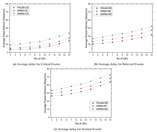 Next, we investigate the average data delivery delay experienced by different data packet types under an increased number of UEs, as shown in Figure 7. Since the increased number of UEs demands augmented transmission opportunities and injects more packets into the network, the general trend of increased delay is observed in all the studied cases. The iRRM considers the repetition factor, time offset, and data rate for radio resource management, which performs better than bRRM in terms of delay and which accounts for inter-carrier-interference only. Finally, the proposed PAUM system exhibits less delay compared to bRRM and iRRM for all data packets due to minimized interference and prioritized network access.