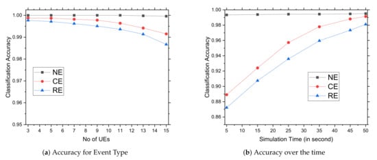 The graphs in Figure 8a,b show classification accuracy of various event types exploiting the Bayes Theorem according to Algorithm 1. At the beginning, sensory data generated by the UEs are used as normal data for communication with eNB in an NB-IoT network. Subsequently, all collected data and their co-relations are used by eNB to classify the events. The eNB identifies event-wise training data, which serve as prior information for determining the likelihood of events, and then Bayesian learning assists in determining the probability of events using prior knowledge and associated conditions. The Figure 8a shows that as the number of UEs grow, the accuracy level gradually decreases. Note that when the number of UEs increases, many sensory inputs may not reach the eNB in a timely manner, causing the event relationships to be misinterpreted. If available data are not present, it can be difficult to locate relevant data for a comparable critical event; nevertheless, there is no trouble identifying a normal occurrence. As a result, regular events are identified with high accuracy, followed by critical events and relevant events. We did not compare classification accuracy with others because they do not have a classification system. Figure 8b depicts categorization accuracy as a function of simulation time, from 5 to 50 s. In the case of probabilistic determination, training data accumulate over time, allowing for more precise estimations of occurrence likelihood. As time passes, training data accumulate, resulting in a more accurate type of event and a more accurate event association. In this diagram, the accuracy for normal events has remained constant since the beginning, whereas critical and relevant event accuracies have been increased over time.