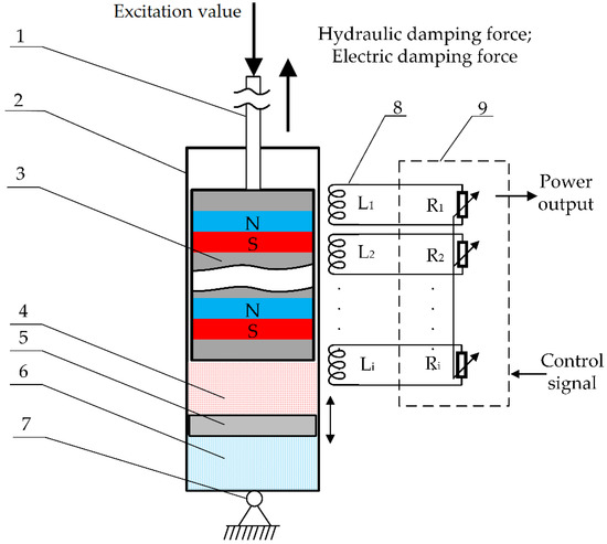 Conceptual prototype structure. 1—slider rod; 2—housing; 3—slider; 4—magnetorheological fluid; 5—separating piston; 6—air chamber; 7—flexible fixture; 8—coil set; 9—power conditioning system.