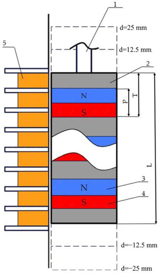 Schematic positions of permanent magnets in the slider. 1—slider rod; 2—non-magnetic material; 3—north magnetic pole; 4—south magnetic pole; 5—coils. Here, L—length of the slider, p—magnet height, and T—period of the segment (magnet plus non-magnetic insert).